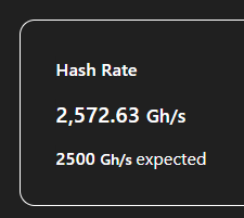 해시는 스팩 대로 2,572 Gh/s (= 2.5 Th/s) 나옵니다.