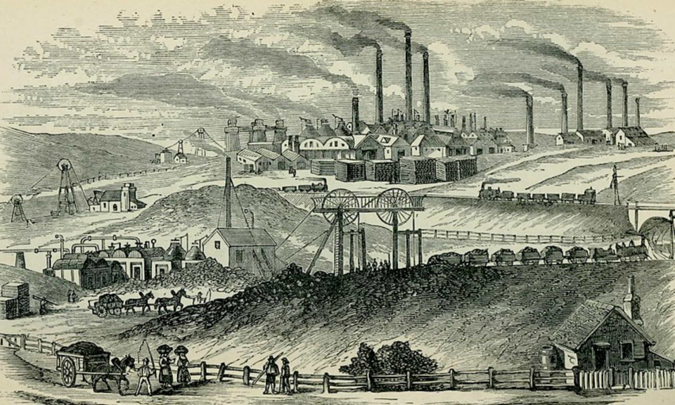 산업 형명 당시 그림인데 대충 이런 구도로 아래쪽엔 사람이 웃고있고 멀리엔 굴뚝에 연기를 표현하는 그림들이 많았습니다.