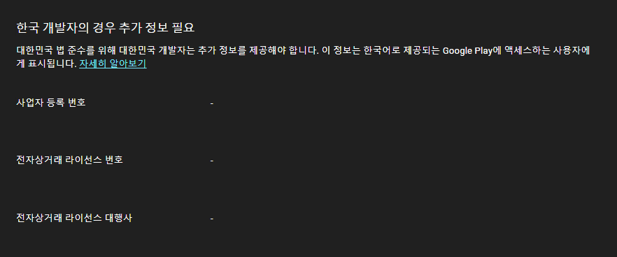 대한민국에 거주하는 모든 개발자는 대한민국 법규를 준수하기 위해 Google Play에 추가 정보를 제공해야 합니다.