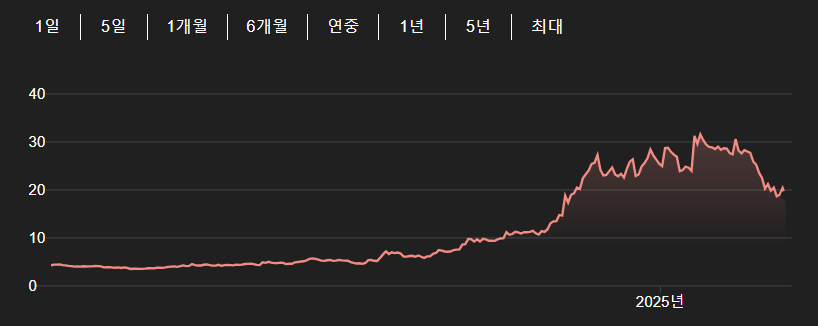 1년치 차트인데요 32 갔다가 현재 18 입니다.