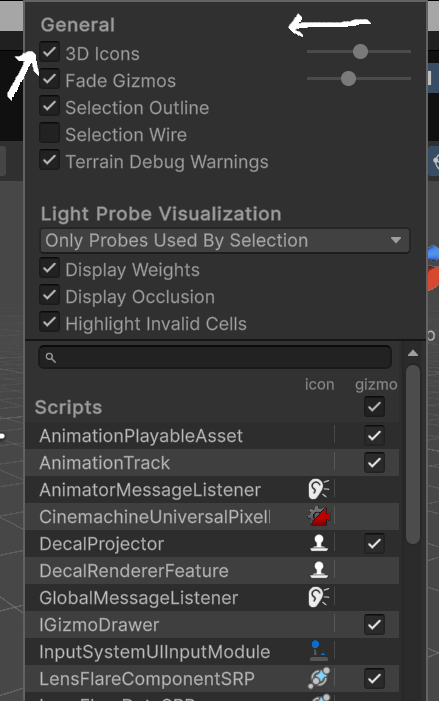 Scne 뷰에서 이런시으로 뭔가 보려고 하는데 아이콘이 방해가 되는 경우가 있다. (거의 100%)