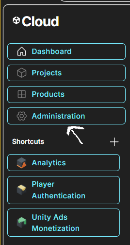 Unity Ads 가 광고 관리하는 곳 입니다.관리를 위해 Administration 을 누릅니다.