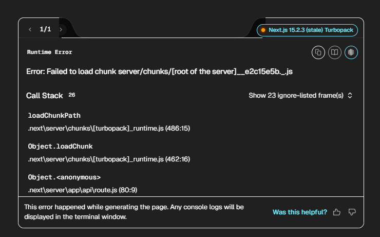 Show 23 ignore-listed frame(s)loadChunkPath.next\server\chunks\[turbopack]_runtime.js (486:15)Object.loadChunk.next\server\chunks\[turbopack]_runtime.js (462:16)Object.<anonymous>.next\server\app\api\route.js (80:9)This error happened while generating the page. Any console logs will be displayed in the terminal window.