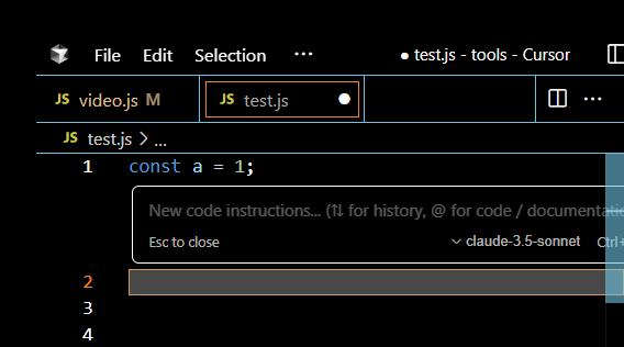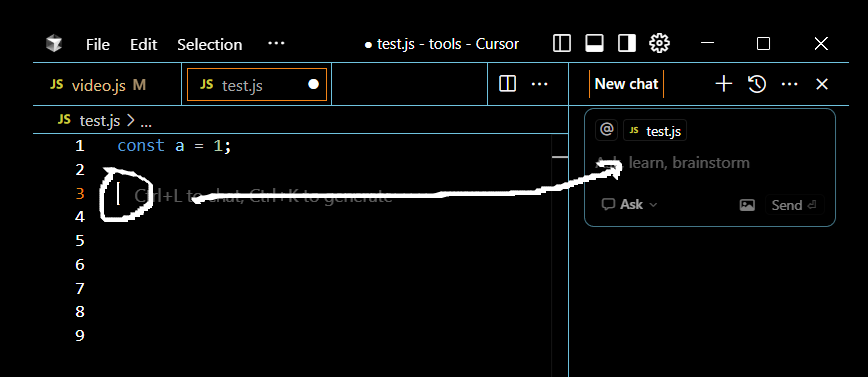 내 커서위치에서 진행하려면 ctrl + k 눌러서 요구사항을 쓰면됩니다.