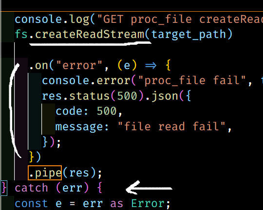 전용 에러 처리함수인 on("error" ~~~) f를 추가로 넣었습니다.