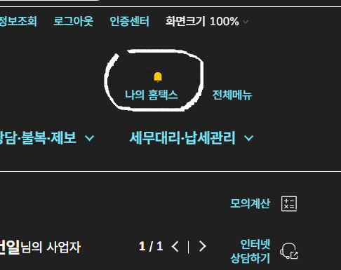 우측 상단의 [나의 홈텍스] 누릅니다.