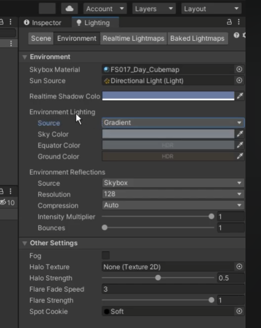 스샷이 흐린데요 인스팩터 말고 라이팅이라는 UI 가 따로 있습니다.