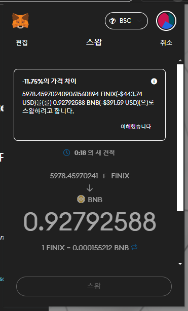 이자농사는 두개의 코인을 묶어서 들어가야해서 BNB 반을 FINIX 로 바꿨습니다.