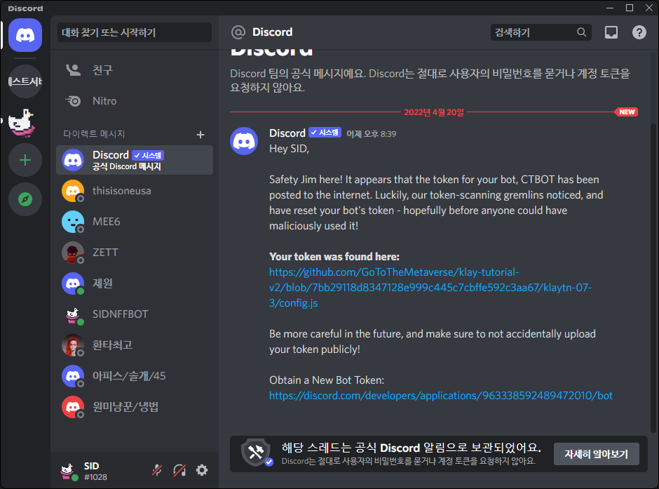 디스코드에서는 디코봇 토큰이 유출되는지를 검사하고 있군요