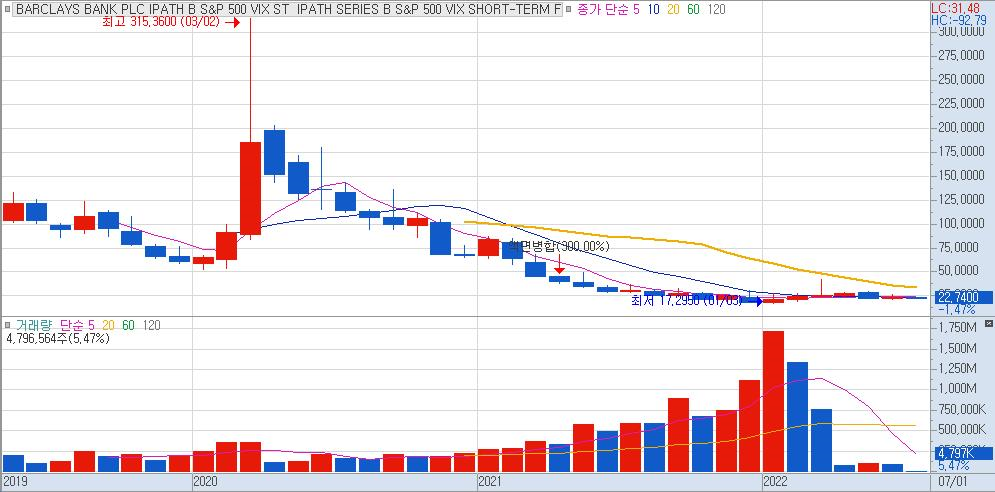 변동성지수 VIX 지수 라고 하는 것을 추종하는 ETF 입니다.