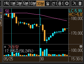 코스모신소재 30분 차트입니다. 다른 것도 비슷한데 여기가 하락이 다이나믹해서 찍어왔습니다.