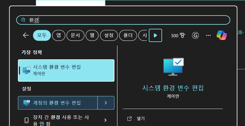 환경변수에 등록해야하니 시작메뉴 열어 `환경` 이라고 치면