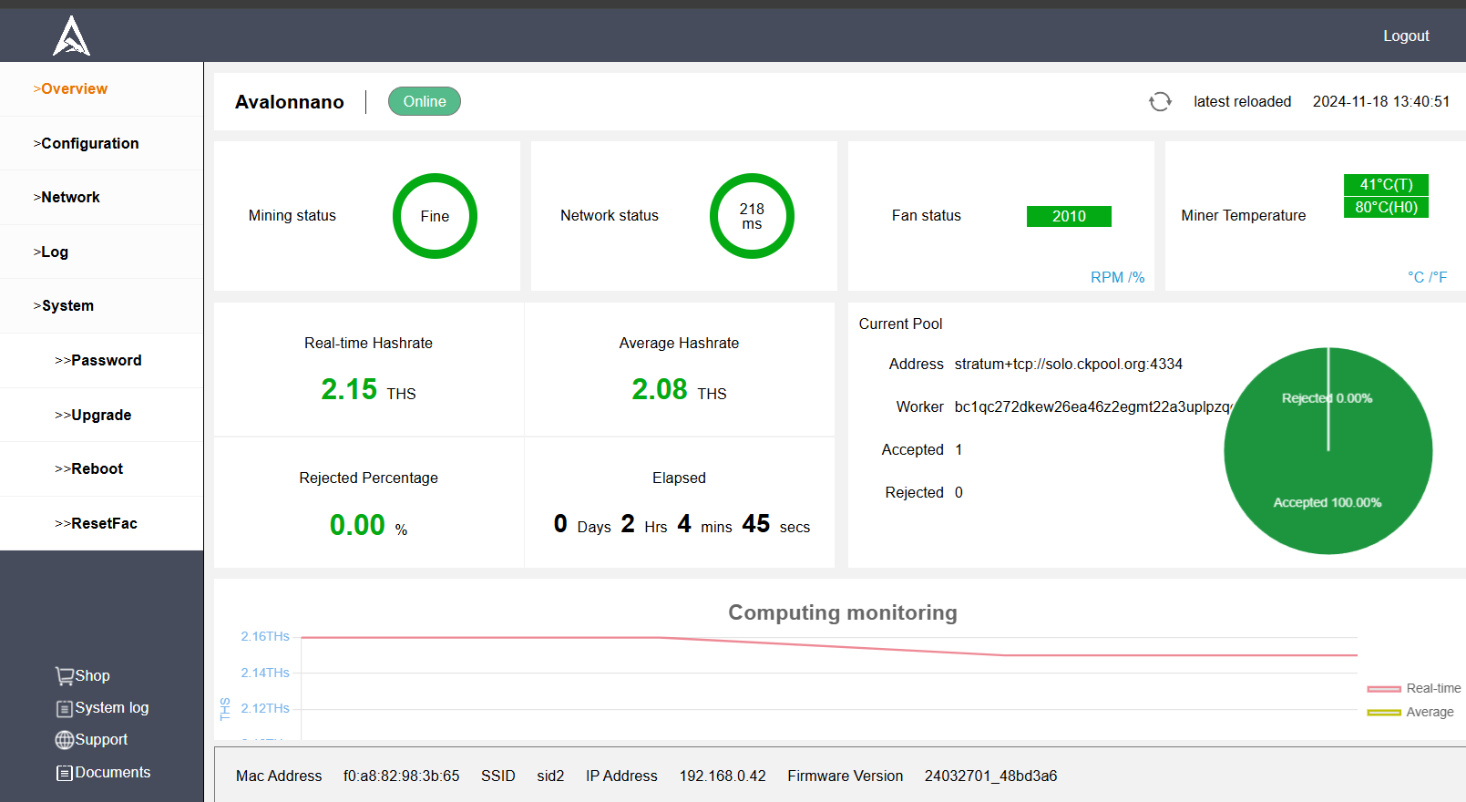 속도는 좋습니다. 4TH/s 로 비트액스 보다 가격 측면에서 좋습니다.