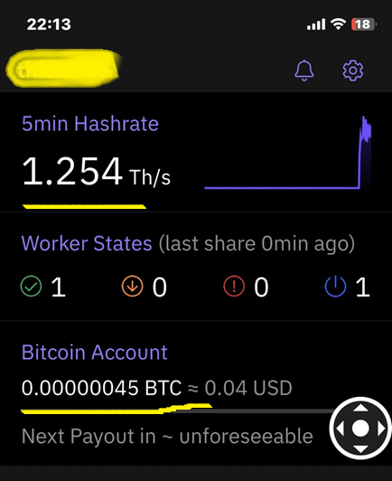 Stratum Password: ??????? <- 알려준 암호를 넣어줍니다.Bixaxe Gamma (1.2TH/s) 로 하루에 80 사토시 정도 기대할 수 있다는군요
