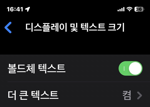 설정 -> 손쉬운 사용 -> 디스플레이 및 텍스트 크기 -> 더 큰 텍스트